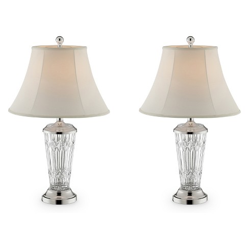 This light can be applied as - living room lighting and family room lighting as well as bedrooms and offices. Clear Crystal Table Lamp with White Shade Set of 2 A classic style with timeless appeal the A classic style with timeless appeal the many-faceted Lilly crystal table lamp will enhance glamorous rooms from Art Deco to transitional. With silver stand and fittings and rectangular shade in linen-weave off.