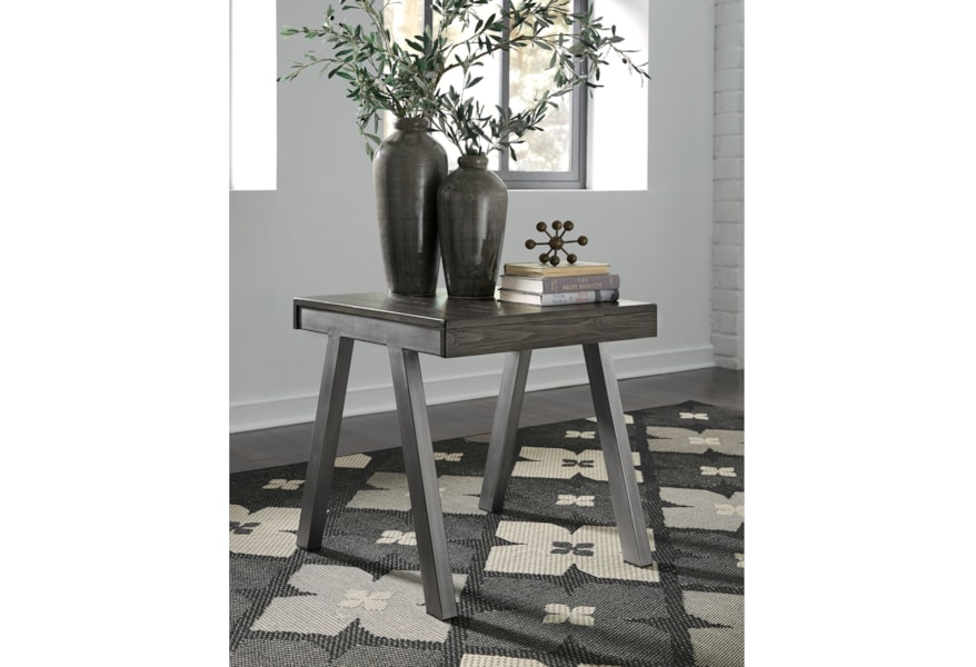 Signature Design Raventown Rectangular End Table With Grayish Brown Table Top And Angled Metal Legs Fisher Home Furnishings End Tables