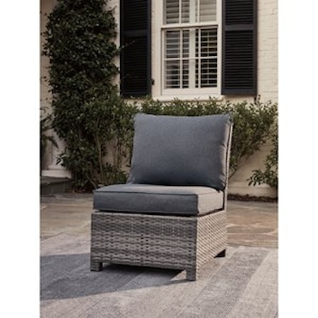 Ideal for using alone or arranging in groups as a sectional the Signature Design by Ashley Silent Brook Armless Patio Lounge Chair is a versatile seating solution for the patio porch or deck. Silent Brooks modular armless design lets you arrange the pieces to suit your living space. All-weather resin wicker and rust-proof aluminum frame ensure carefree living.
